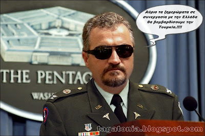 Αυτός είναι ο νέος εκπρόσωπος τύπου του Αμερικανικού πενταγώνου όπως βλέπετε και στην φωτογραφία που δημοσιεύουμε σήμερα.Διορίστηκε από την κυβέρνηση Ομπάμα πρίν λίγες μέρες και η μεγάλη είδηση είναι ότι είναι Ελληνοαμερικανός.!!!!Το ονομά του George Fotos και ήταν διοικητής της στρατιωτικής δύναμης του Ιράκ.Είναι πολύ σκληρός στρατιωτικός όπως φαίνεται και από το ύφος του στην φωτό και τον τρέμουν όλοι στο στράτευμα.Τα φανταράκια κυριολεκτικά "χέζονται" πάνω τους μόλις τον αντικρύσουν και όχι άδικα αφού περνάει και μοιράζει κάμψεις σε όποιον βρεθεί στον δρόμο του και αυτός γελάει.!!!Πρίν λίγες μέρες έστειλε τον διοικητή μιας μονάδας τουαλέτες επειδή του έκανε τον έξυπνο..Βέβαια για εμάς είναι πολύ καλή επιλογή διότι δεν χωνέυει καθόλου τους Τούρκους και τους Σκοπιανούς και θέλει να τους ξεκάνει.Φαίνεται ότι τα προβλήματα με τους γείτονες θα λάβουν τέλος σε λίγο καιρό και εμείς θα γίνουμε τα αφεντικά στην περιοχή.Περιμένουμε πολλά από τον νέο εκπρόσωπο και είμαστε αισιόδοξοι.(Αν σου τύχει τέτοιος διοικητής όταν πάς φαντάρος ΚΑΗΚΕΣ!!!!)